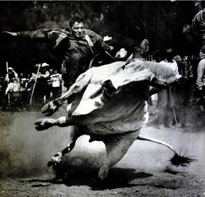 26,35,36 He also traveled throughout California taking rodeo pictures, getting in the ring with with bulls and broncos with his large-format Graflex camera to get the best photos. He developed the photos in a small travel trailer outfitted as a laboratory and sold them to the cowboys while still at the events. He was fond of telling about other photographers being amazed that he was using the type of camera he did, because the image he was viewing in the camera was reversed left to right, creating the danger that he would run the wrong way to escape a charging animal.
